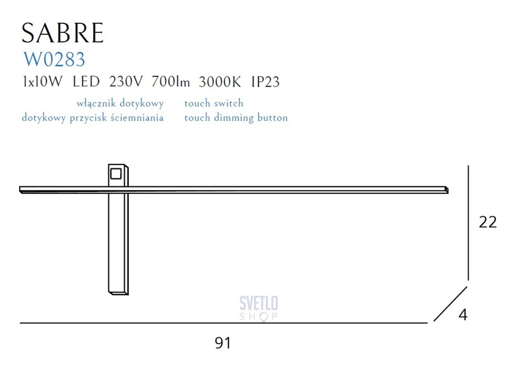 Napájanie: 1 x 10W LED 230V, 700 LM, CRI90 3000K, IP23 W: 91 cm, D: 4 cm, H: 22 cm Farba: čierna Materiál: kov/akryl Napájací zdroj + stmievateľná LED v balení Obsahuje stmievateľný dotykový spínačDodatočné parametre