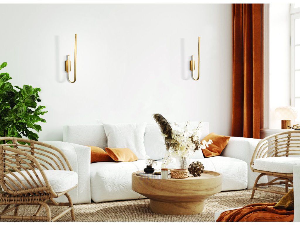 - Nástenné interiérové svietidlo, kovová konštrukcia z hlíníka v matnej zlatej farbe. Difúzor z bieleho akrylu.