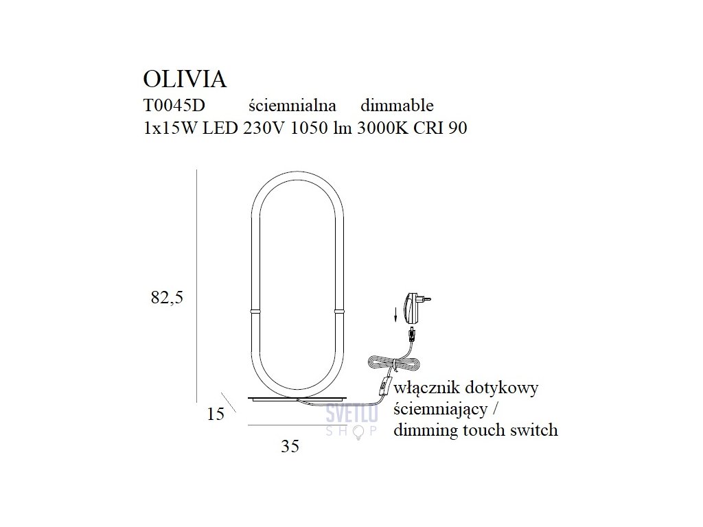 Napájanie: 1 x 15 W LED 230V, 1050 LM, CRI 90, 3000K W: 35 cm, D: 15 cm, H: 82,5 cm Farba: zlatá Materiál:nerezová oceľ/akrylové sklo/silikón Triak stmievateľná LED + ovládač v balení Nástenný stmievač nie je súčasťou balenia Obsahuje stmievací dotykový spínač na kábliDodatočné parametre