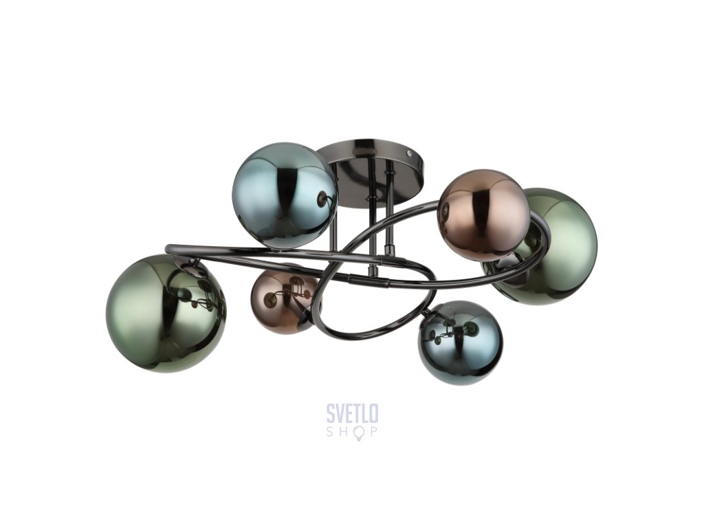 Stropné svietidlo, kov sivý matný, sklenené gule, farby skla: bronzová, zelená, petrolejová, ø: 650mm, V: 250mm, rozmery skla: 2x15cm, 2x 12cm, 2x 10cm, vrátane 6x G9 LED 3,5W 230V, zdroj 350lm, výstup 290lm, 3000K