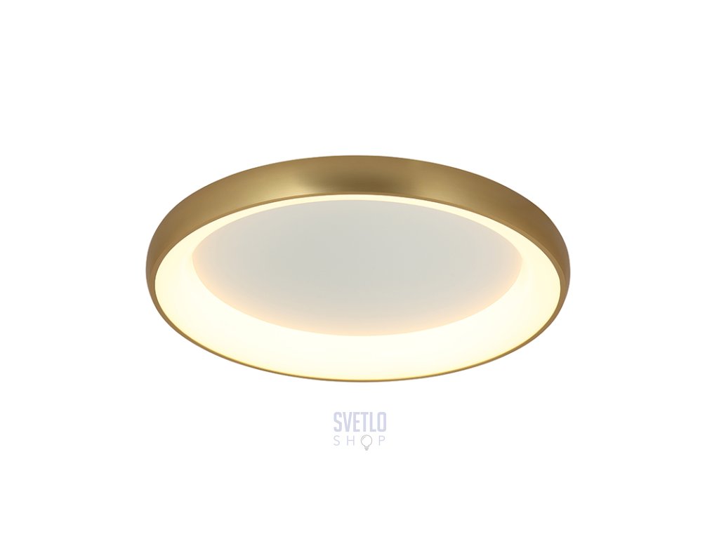 - Stropné interiérové svietidlo, kovová konštrukcia z brúseného hlíníka v matnej zlatej farbe. Difúzor z bieleho akrylu.