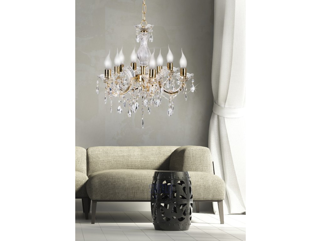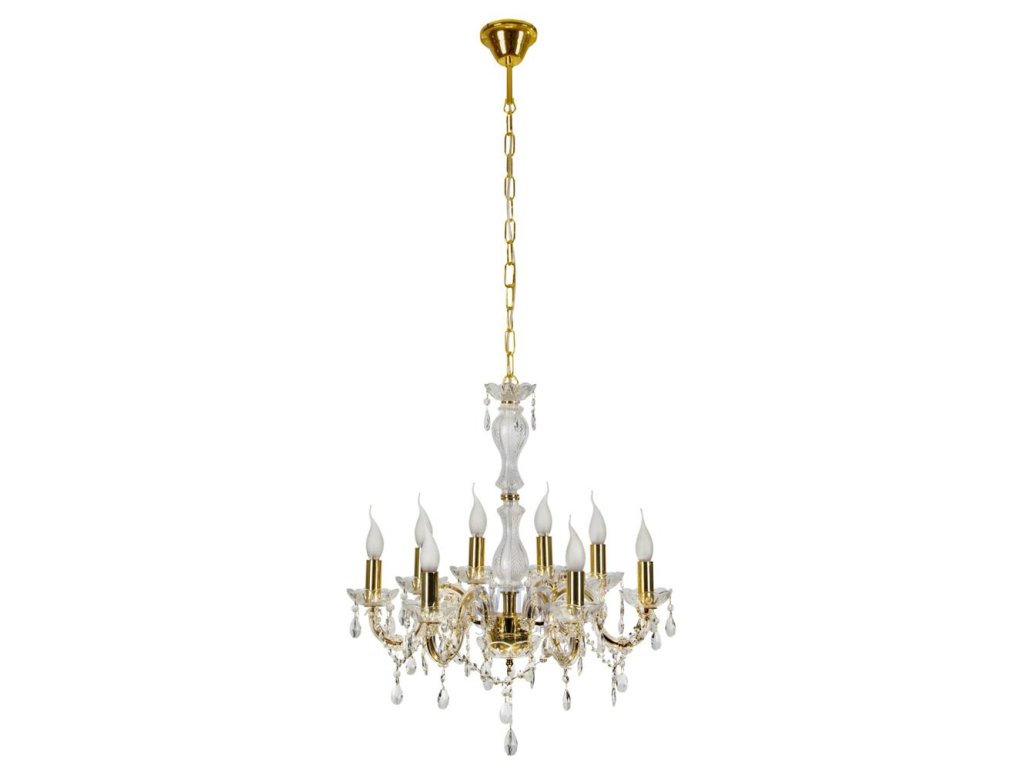 Závesné svietidlo 8X40W E14 zlatý - Materiál: oceľová základňa, reťaz, dekoratívne sklo, bez tieňa - Rozmery v cm (v/š/h): 130x62x62 - Balenie NEOBSAHUJE žiarovku!Dodatočné parametre