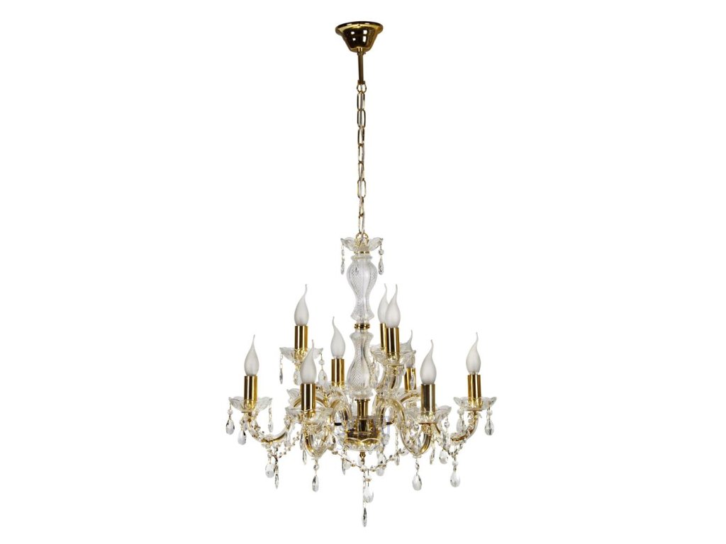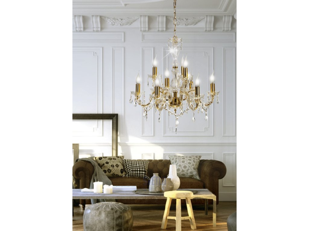 Závesné svietidlo 9X40W E14 zlaté - Materiál: oceľová základňa, reťaz, dekoratívne sklo, bez tieňa - Rozmery v cm (v/š/h): 130x62x62 - Balenie NEOBSAHUJE žiarovku!Dodatočné parametre