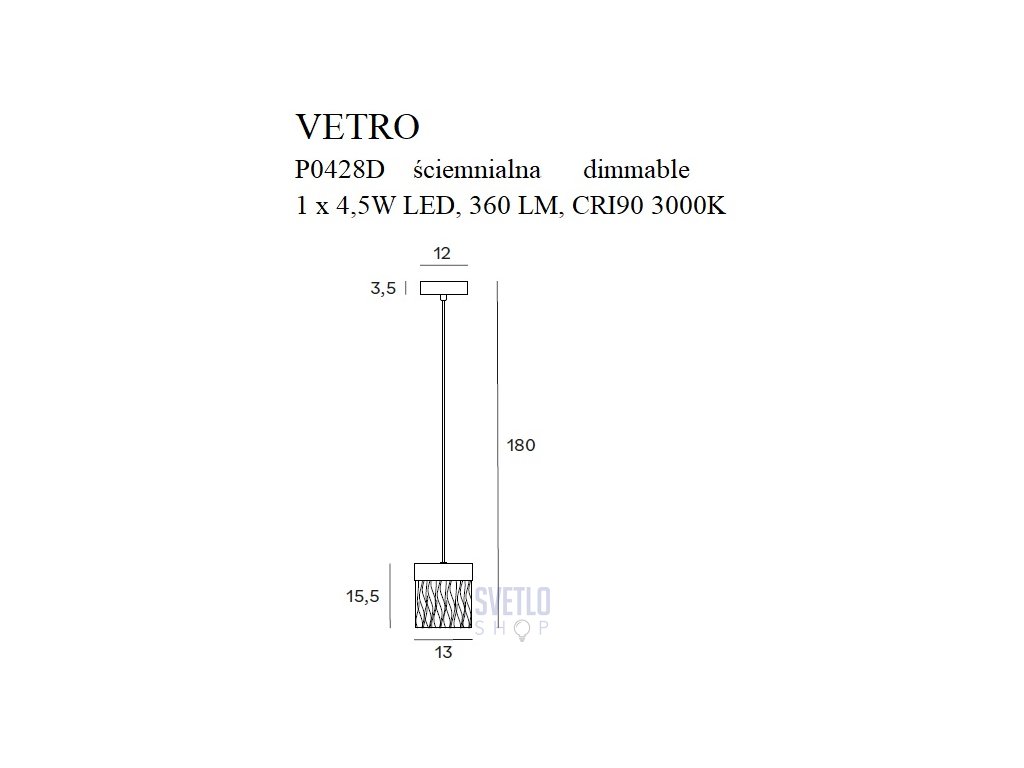 Napájanie: 1 x 4,5W LED 230V, 360 LM, CRI 90, 3000K W: 13 cm, D: 2,2 cm, H: max 180 cm, h: 15,5 cm Farba: zlatá Materiál: nerezová oceľ/sklo Triak stmievateľná LED + ovládač v balení Nástenný stmievač nie je súčasťou baleniaDodatočné parametre