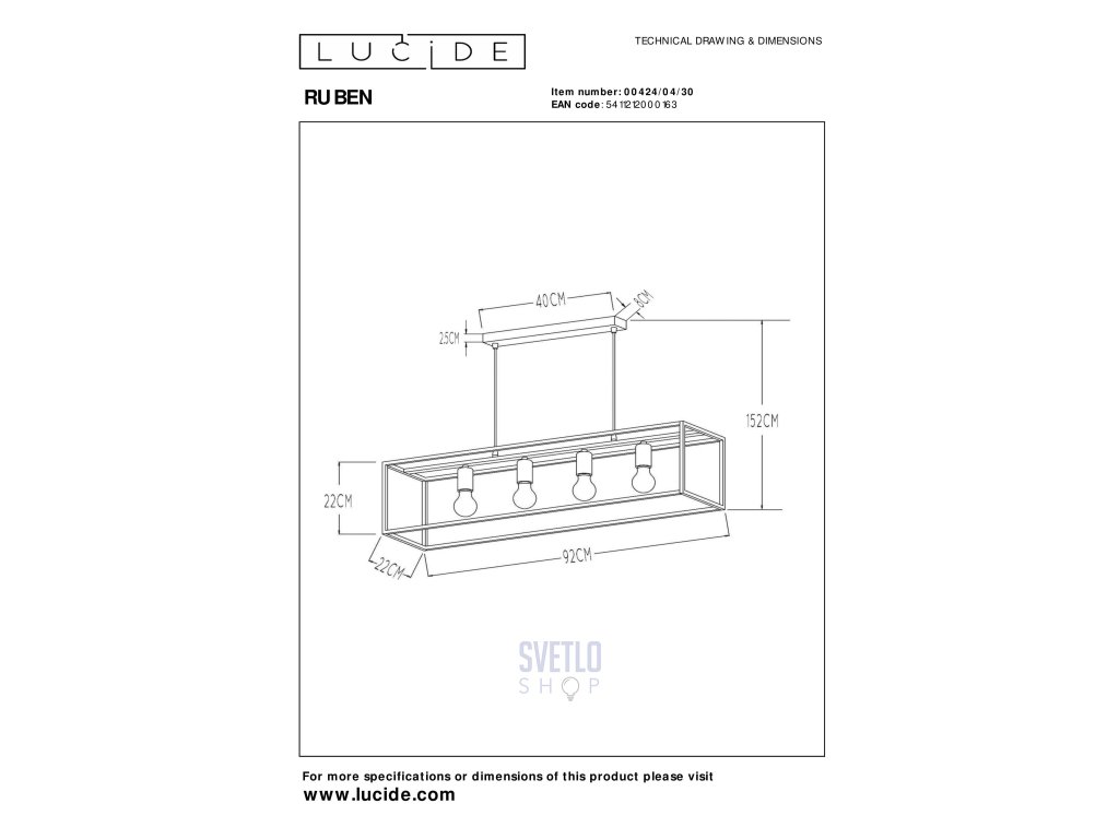 - Spotreba energie: 4x40W / 230V / stmievateľný (nie je súčasťou dodávky)