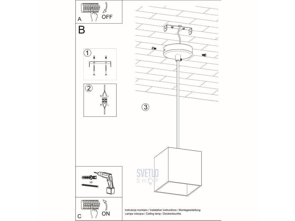 Závesné svietidlo QUAD môžete rýchlo a bez námahy namontovať na strop. Praktická inštalácia znamená, že stačí len niekoľko minút a môžete si užívať krásnu žiaru v celej miestnosti.