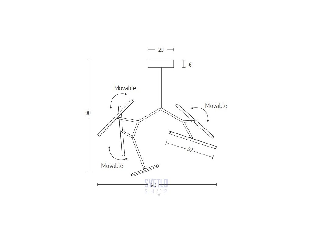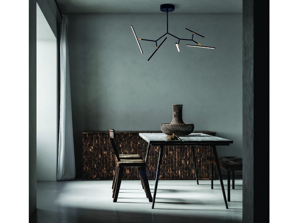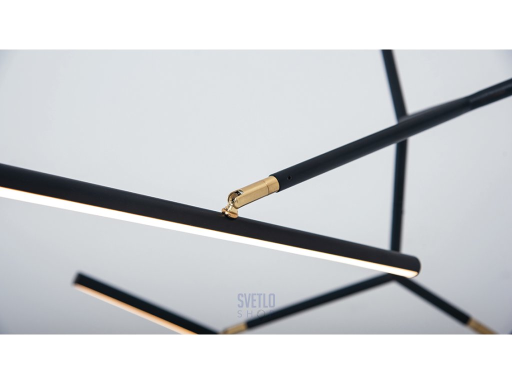 - Závesné interiérové svietidlo, kovová konštrukcia z hlíníka v pieskovej čiernej farbe s matnými zlatými detailami. Pohyblivý profil. Difúzor z bieleho silikónu.