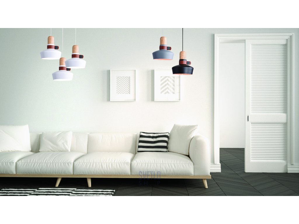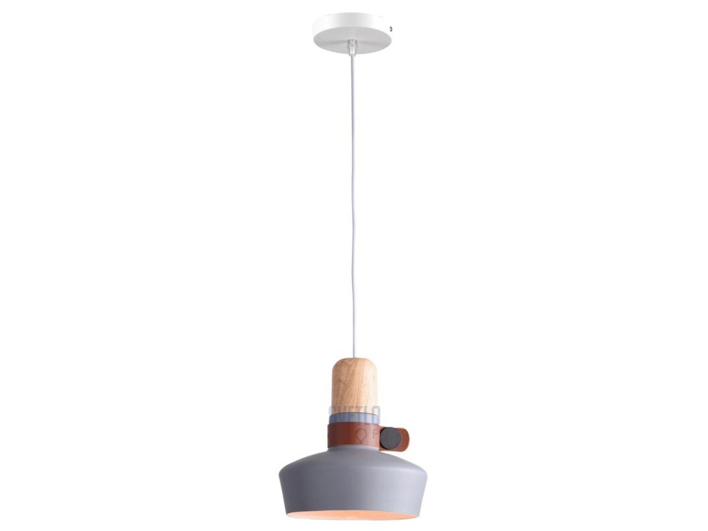- Závesné interiérové svietidlo, kovová konštrukcia v matnej bielej farbe, biela šnúra na zavesenie, doplnky z prírodného dreva a kože, tienidlo z kovu v šedej farbe.